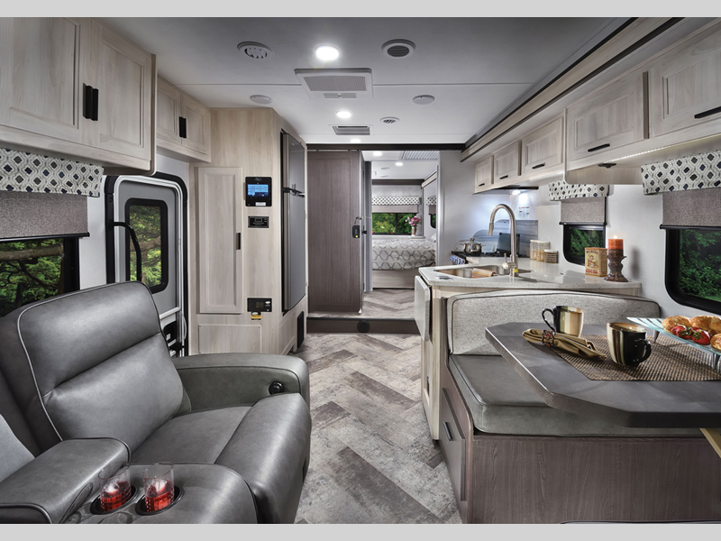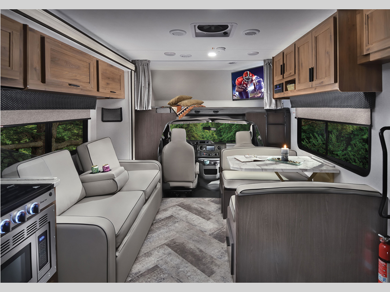 Each model includes an EZ Ryde upgraded suspension system for a smooth drive each time, plus a 10" touch screen and backup camera/side view cameras with a 3-way monitor for easy maneuvering at the campground. The 2" aluminum framed laminated sidewalls and SuperLite composite substrate provide a strong motorhome made to last, and the block foam insulation means you can camp year around. Head inside to find black out roller shades, soft touch self-closing drawer guides, an oxygen-infused shower head, plus a 12V USB charging station to keep your electronics charged and ready to go.
