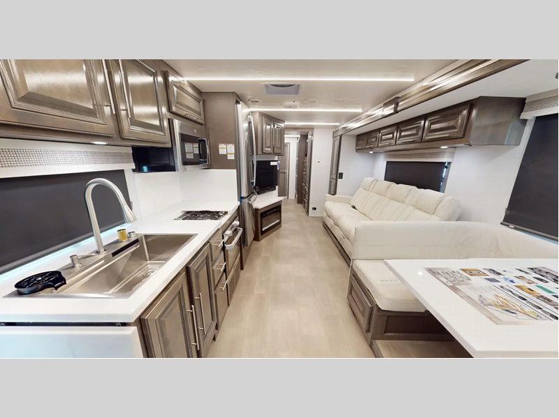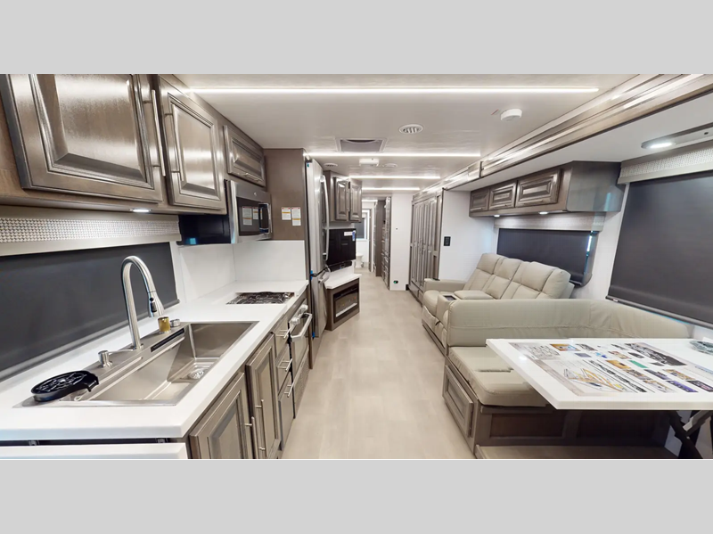 Sleeps 4 Slides 2 Length 37 ft 11 in Ext Width 8 ft 4 in Ext Height 12 ft 11 in Int Height 7 ft Exterior Color Azure, Columbia, Obsidian, Nautique ll Hitch Weight 5000 lbs GVWR 26000 lbs Fresh Water Capacity 73 gals Grey Water Capacity 52 gals Black Water Capacity 52 gals Furnace BTU 35000 btu Generator 6,000W Yamaha Fuel Type Gas Engine 7.3L V8 Chassis Ford F53 Horsepower 350 hp Fuel Capacity 80 gals Wheelbase 252 in Number Of Bunks 1 Available Beds King Torque 468 ft-lb Refrigerator Type Stainless Steel 3 Door Residential w/Water and Ice Refrigerator Size 18 cu ft Cooktop Burners 3 Number of Awnings 1 Axle Weight Front 9000 lbs Axle Weight Rear 17500 lbs LP Tank Capacity 24.5 Gal Water Heater Capacity 10 gal AC BTU 30000 btu TV Info LR 40" LED TV, BR 32" LED TV, Ext. 40" TV Awning Info 20' Encased Power Patio Awning with LED Light Washer/Dryer Available Yes Gross Combined Weight 30000 lbs Shower Type Shower w/Seat Electrical Service 50 amp Similar Floorplans